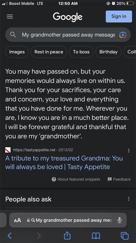 My grandma was an amazing woman she was always there when I needed her she would always take me to my softball practice and never missed a single game!!! Your wings were ready but my heart was not I can’t believe your gone grandma I love you so much you will forever be in my heart and won’t go a day without thinking about you may you be in peace and not suffering anymore